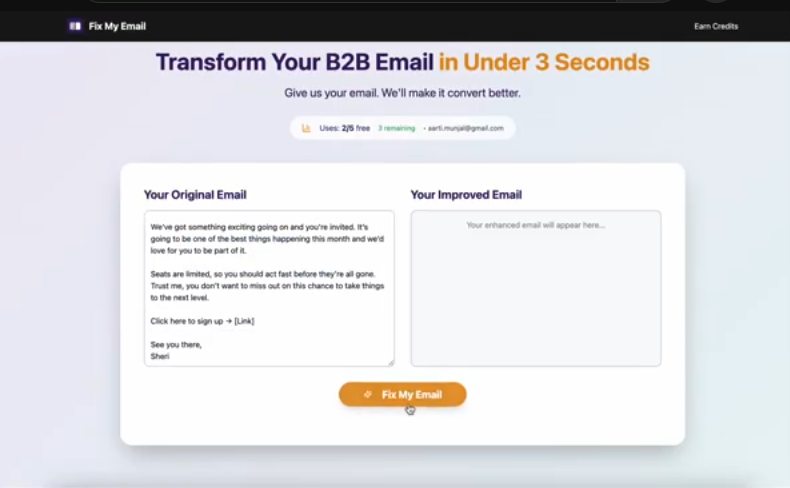 FixMyEmail is different. It’s built specifically to rewrite B2B emails using proven conversion frameworks, sales psychology, and decision science. It sharpens your message so the right people take action—without you needing to know what to ask or how to phrase it.